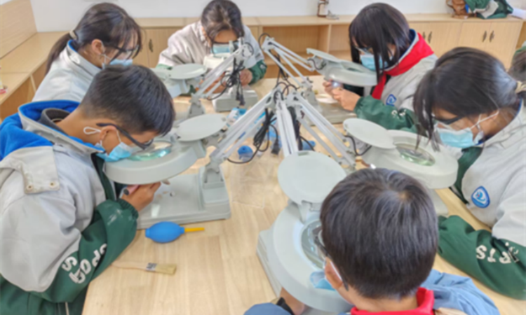 动手实验,培养科学探究精神。在实验室环节,学生们分组围坐在长桌前,使用台式放大镜仔细观察各种样本。他们佩戴着口罩和眼镜,神情专注,展现出小小科学家的风范。桌面上摆放的吹尘球和刷子等专业工具,让学生们体验了科学研究的严谨性。通过亲手操作,同学们不仅学到了科学知识,更培养了观察力和团队协作能力。“我喜欢自己做实验的感觉,就像真正的科学家一样。”一位女生一边调整放大镜一边说道。这种实践性学习方式让孩子们对科学产生了更加浓厚的兴趣。