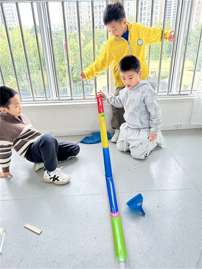 孩子们自由地选择着材料:有的全部用PVC管,搭建出科幻感十足的“时空隧道”;有的坚持用小积木,构建出精巧复杂的“立体迷宫”;更多的孩子则是“混搭派”,创造出了形态各异、功能多样的复合型轨道。