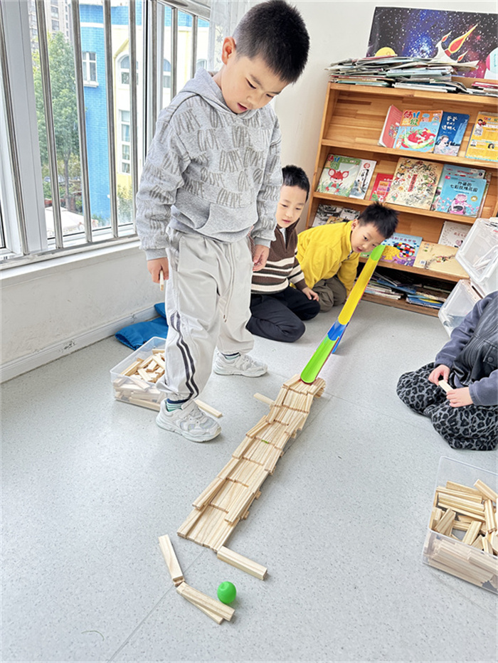 这个提议瞬间点燃了同伴的热情。一场“搜寻大赛”开始了!很快,乒乓球、瓶盖、圆圆的有一定重量的轮胎积木、重重的小钢球,都成为了新的实验对象。