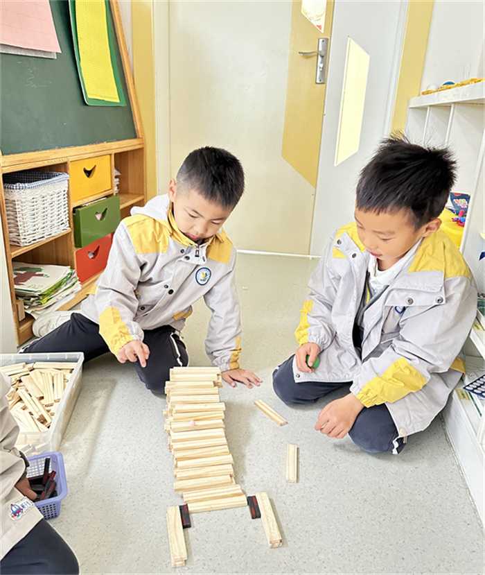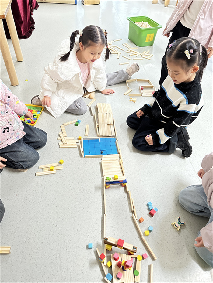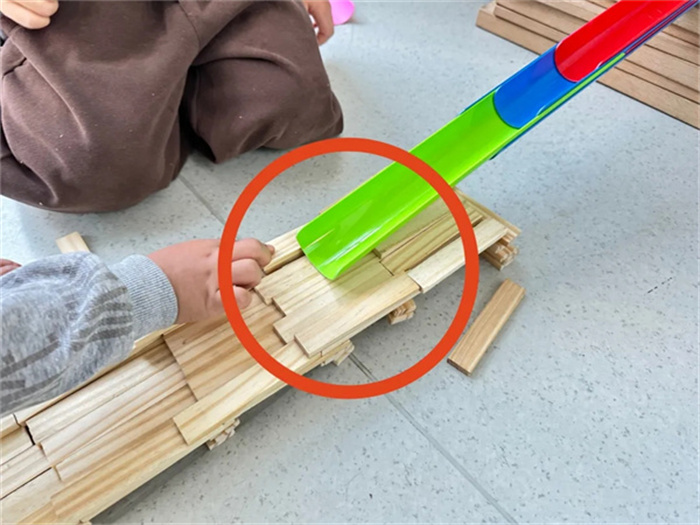 孩子们通过反复试错,自发地开始调整。他们会用积木或者其他材料作为“桥墩”支撑PVC管,会在接口处垫上小木片找平,会对比哪种组合方式更稳固。在这个过程中,他们不再是简单的搭建者,而是成为了材料的驾驭者和空间的规划师。