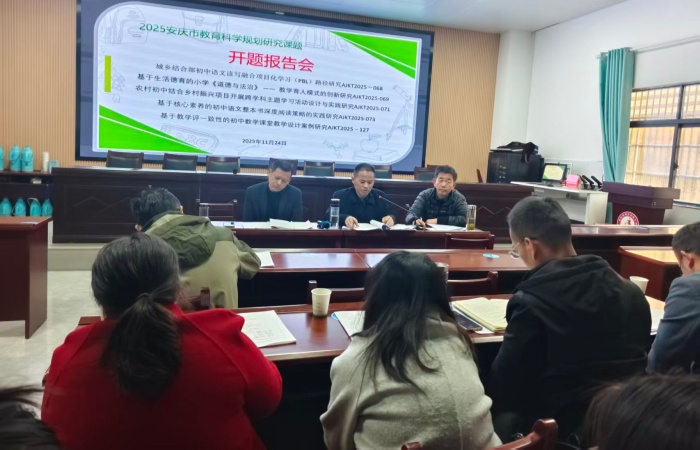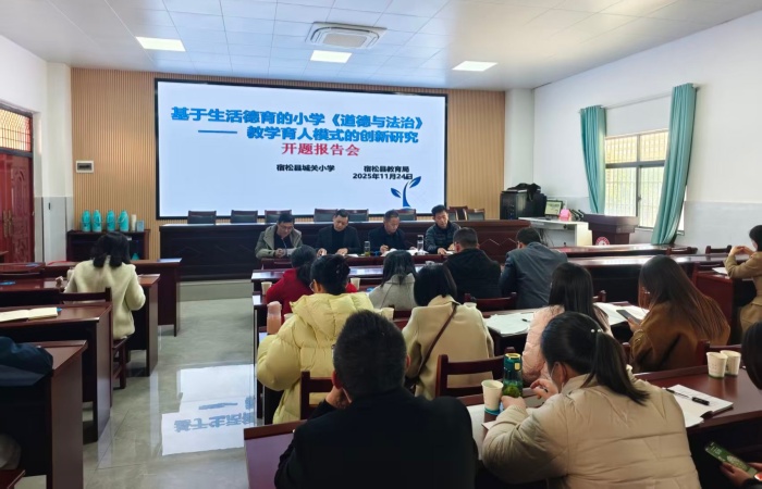 11月24日下午,宿松县城关小学2025年度安庆市教育科学规划研究课题《基于生活德育的小学〈道德与法治〉教学育人模式创新研究》开题报告会,在城关初中圆满召开。会议由县教研室主任欧阳明主持,省市级课题研究专家、城关初中副校长季正宏,县教研室主任朱旭南应邀莅临指导,城关初中校长杨文亮出席会议并致辞,旨在精准论证课题研究科学性与可行性,明晰研究方向、理顺实施思路,为课题规范推进、成果落地筑牢基础。