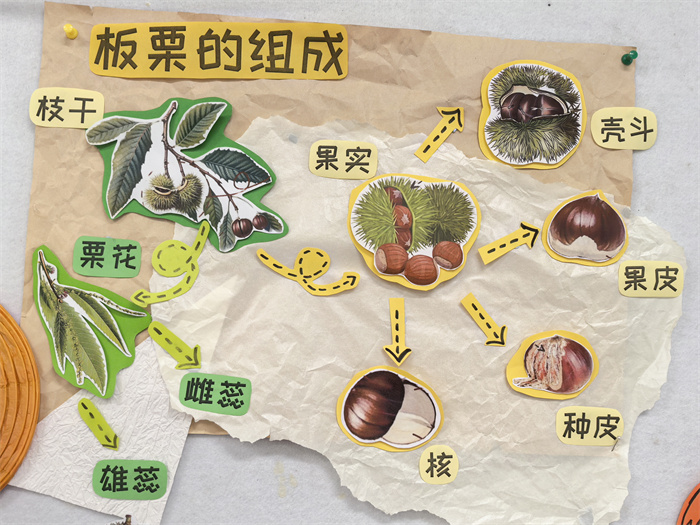 从创意提出到成果分享,孩子们全程参与设计并动手实践。从直接感知、实际操作、亲身体验等一系列真实操作中,不断提升幼儿的经验,最后落实到每个孩子的实践探究当中。通过多维度的活动让孩子们在观察、实践、创作中感受大自然季节更替的变化更丰富了板栗的认知。