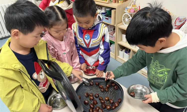 经过这次的探索板栗,孩子们对板栗的兴趣日益浓厚。一次谈话中孩子们表示甜甜的糖炒栗子非常适合秋天的午后,纷纷表示自己也想做糖炒栗子。于是我们准备了板栗、食用油、白糖等材料,共同制作糖炒栗子。他们通过看、闻、摸,认识了制作炒栗子的原材料,并讨论了健康饮食的重要性。