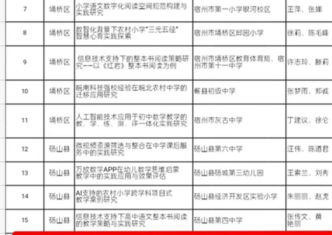 近日,2025年宿州市基础教育科学研究课题立项名单和2025年宿州市教育信息技术研究立项课题名单相继揭晓。砀山县第四中学校申报的三项课题《学习任务群视域下薄弱高中语文大单元教学实践研究》代飞亚、马松,《心理健康教育融合中学语文课程教学的实践研究》周旭东、张萍莉,《信息技术支持下高中语文整本书阅读的教学策略与实践研究》黄艳丽、张传文申请的三项课题均成功立项。该校五位教师凭借扎实的学术积淀与创新的研究视角脱颖而出,为该校科研成果再添新彩。