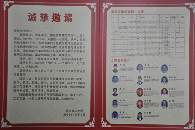 为搭建开放共享的教学研讨平台,加强校际教学经验交流,提升教师专业素养与课堂教学效能,11月25日至27日,颍上第三中学联合颍上县第四教研片区成功举办初中校际联动教研交流活动。本次活动以“聚焦课堂促改革,开放共研向未来”为主题,为期三天,吸引了片区内多所学校教师代表及县教育局教研室各科教研员与颍上三中全体师生共同参与。