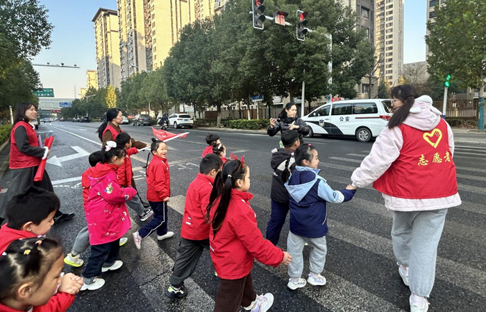 “出发去路口学安全啦!”随后,在老师、志愿者和交警的全程守护下,孩子们排着整齐的队伍,来到校园附近的“实景教学点”——这个路口是社区通过网格化排查精心选定的,交通流量适中、标志清晰,特别适合小朋友实地学习。“这是斑马线,是行人的安全通道哦!”交警叔叔阿姨一边引导孩子们辨认红绿灯、警示标志,一边演示安全过马路的步骤。孩子们分组实践“一停、二看、三通过”,认真观察来往车辆,在志愿者的陪伴下有序走过斑马线,把课堂里学的知识妥妥转化为实际行动。
