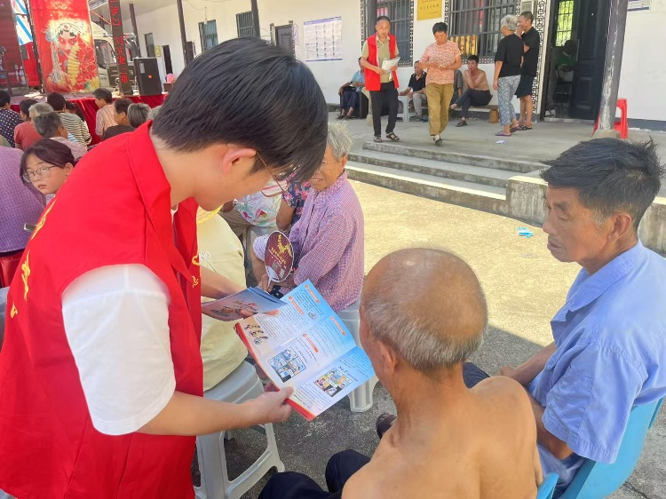 演出尚未开始,村民们便早早来到现场,或搬来板凳有序就座,或骑着电动车、三轮车,满怀期待地等候大戏开场,现场氛围热烈。随着锣鼓声响起,演出正式开始。演员们身着精美戏服,以精湛的演技、婉转的唱腔,为村民们带来了经典黄梅戏选段《孝子状元》。“从小到大从未离开我娘,娘不在身边我怎度日光”一句唱腔扣人心弦,《孝子状元》讲述了两个关于孝道和科举的民间故事,弘扬了古代的孝道文化。台上演员们的精彩表演,将戏曲人物刻画得淋漓尽致,台下村民们看得如痴如醉,不时爆发出阵阵掌声与喝彩声。演出间隙,相关工作人员通过发放宣传图册、讲解案例、面对面答疑等多种方式,宣传安全生产、交通安全、反家庭暴力等法律知识,并向群众普及非法金融活动的常见形式、危害及防范方法,提升群众防范非法集资等非法金融活动的意识和能力,全力守护好大家的“钱袋子”。