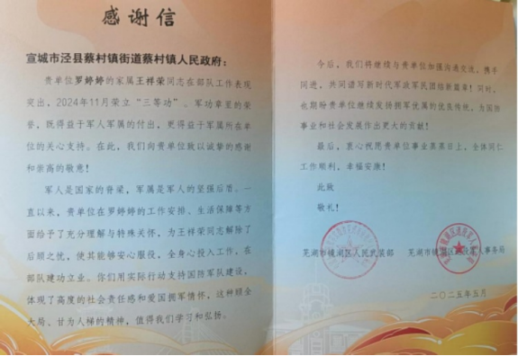 近日,芜湖市镜湖区人民武装部与退役军人事务局联合向泾县蔡村镇人民政府发来感谢信,对蔡村镇在支持军属工作、生活等方面给予的特别关怀表示衷心感谢,高度赞扬蔡村镇在拥军优属方面作出的积极贡献。