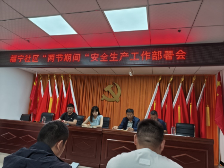 高度重视,精心部署。福宁社区召开“两节期间”安全生产工作部署会,成立联合督查小组,应急小组,制定详细方案,落实相关举措,周密部署福宁社区各片区负责人要强化思想认识,压实责任意识,对当前安全生产形势进行分析研判。各片区要结合自身实际情况,制定排查方案,要以高度的责任感和使命感投入到此次排查工作中。