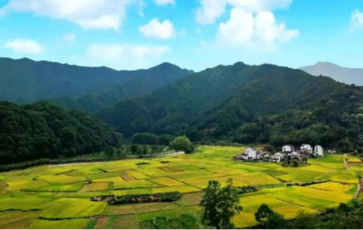 步入其间,稻田间古色古香的皖南徽派建筑错落有致,与周围如诗如画的田园风光完美融合,更增添了几分独特的韵味。沿着清澈见底、静静流淌的沂源河漫步,只见金黄色的稻田如一条彩带将这片丰收的土地紧紧环绕相拥。河岸边绿树成荫,山峦连绵起伏,共同构成了一幅和谐美妙的自然画卷。