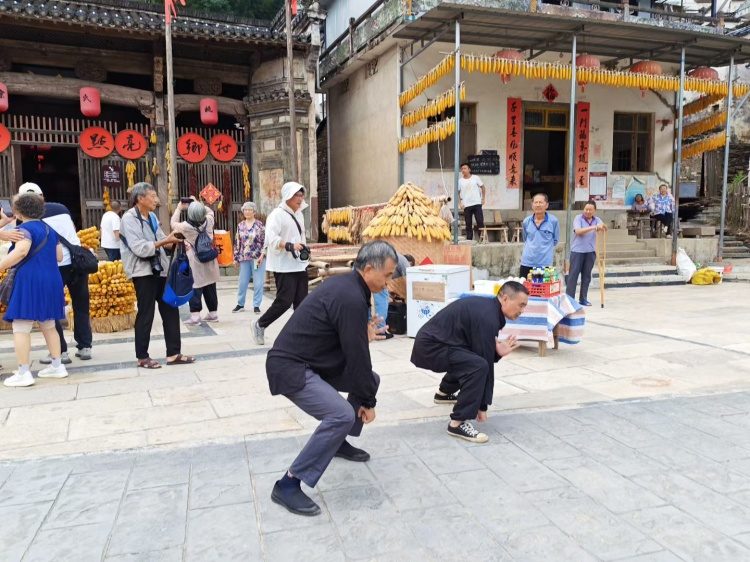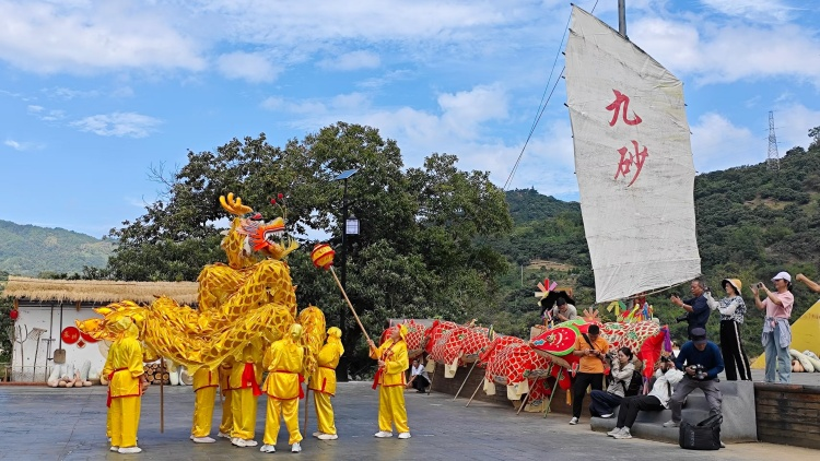 定潭舞龙率先登场,蜿蜒盘旋于九砂村江畔,宛如一条活灵活现的巨龙,在秋日里熠熠生辉。瞻淇鱼灯相向而行,鱼灯以鱼为形、以竹为骨,在鱼灯手艺人手中翻舞,在锣鼓声中肆意遨游,将幸福吉祥送给每一位游客。漳岭山武术表演刚劲威猛,一招一式尽显大家风范,喝彩声此起彼伏。这些表演不仅生动传递了徽州人民对丰年和团圆的美好祝愿,也为秋日的九砂江畔带来了热闹与喜庆。