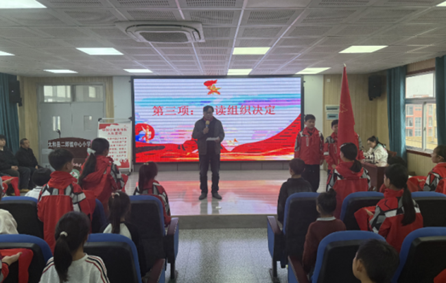 在宣读组建少先队组织的决定环节,陶玉林校长宣布新建一(1)至一(4)共四个中队,进一步完善了学校少先队组织体系。大队委员王墨宣读了新队员名单,靳绍宇、靳晓、王一一、王昱恒等60名同学经审核批准,正式加入中国少年先锋队。