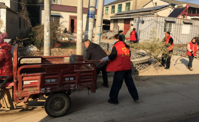 活动中,党员志愿者们身穿红马甲,手持扫帚、铁锹等工具,分工协作、干劲十足。有人细致清扫主干道上的落叶、纸屑等生活垃圾,不放过任何一个卫生死角;有人挥动铁锹,认真清除道路两侧因施工遗留的泥土硬块以及长期堆积的枯枝朽木。面对路面积存的污水,志愿者们耐心疏通排水口,引导污水有序流入指定排放点,有效避免了污水横流对村民生活和出行的影响。同时,两辆三轮车往返清运,及时将各类垃圾集中转运,切实做到“扫一处、清一处、净一处”。