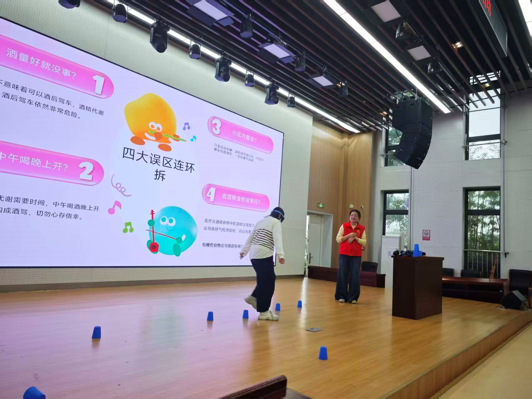本次活动环节丰富,注重互动与体验1、“标识会说话”——交通标识我知道:通过精美的PPT图片展示,社区志愿者带领同学们认识并理解警告、禁令、指示等各类交通标识的含义。并以“标识快问快答”的方式,让这些沉默的“道路语言”成为大家出行的安全指南。2、“安全伴我行”——行车乘车守规则:志愿者结合初中生的生活实际,重点讲解步行、骑行自行车以及乘坐公交车、私家车时的安全准则。包括如何正确过马路、骑行时为何不能戴耳机、为何要远离车辆盲区,以及上车系好安全带的重要性等实用知识。学生们认真听讲并在互动环节积极响应,巩固学习成果现场氛围极好。3、“醉”不容恕——酒驾知识大揭秘:这是本次讲座的特色环节。社区志愿者通过科学知识讲解,让大家了解酒精如何影响人的判断力和反应能力。并邀请同学佩戴特制的模拟酒醉状态的眼镜,进行走直线、捡东西等简单任务,亲身体验“酒驾”下的视觉扭曲和行动困难,以最直观、震撼的方式感受酒驾的巨大危险。