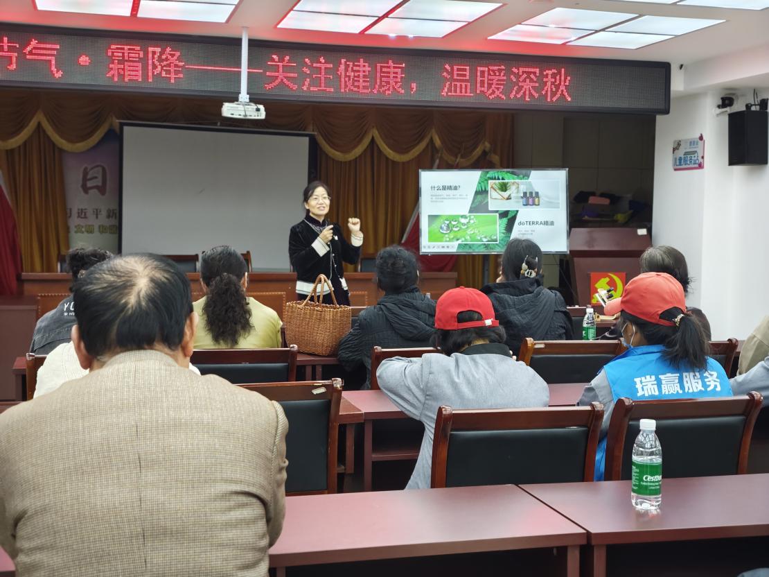 活动现场暖意融融,老人们聚精会神聆听讲座的身影,市集间邻里相遇互致问候的盈盈笑语,共同交织成深秋里最温暖的社区图景。健康知识讲座上,益群社工邀请“青锋达人库”的芳疗老师为辖区老人们深入浅出地讲解霜降时节的养生之道,为老年朋友的秋季健康保驾护航;暖心服务市集更是人气十足,义诊区的血压、血糖测量服务贴心便捷,政策宣传区的医保养老咨询耐心细致,防诈普法区的志愿者们用鲜活案例守护着长辈们的“钱袋子”。穿插其间的戏曲演唱与健康知识有奖问答,更在轻松愉快中传递了关怀与智慧,营造尊老、爱老、助老的和谐社区氛围。
