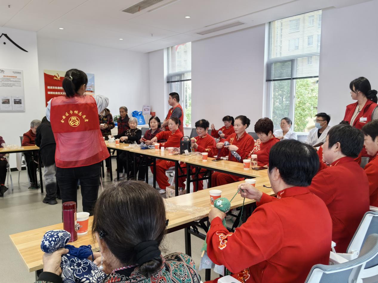 “为救李郎离家园,谁料皇榜中状元……”黄梅戏表演区里,社区文艺队的志愿者演唱《女驸马》《天仙配》等经典选段,字正腔圆的唱腔、生动传神的表演,引得台下老人们跟着拍手哼唱,不少老人还主动上台与演员合唱,过足“戏瘾”。手工体验区里,党员志愿者手把手教老人们制作艾草锤:整理晒干的艾草、填充纯棉布袋、用彩绳缠绕装饰,大家一边交流制作技巧,一边分享养生心得。活动现场,社区工作人员还为每位老人送上重阳糕和菊花茶,让传统节日充满“家的味道”。
