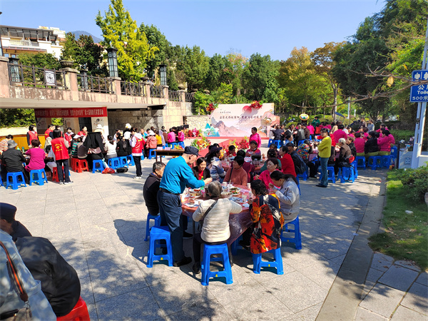 百家盛宴:邻里共享舌尖上的温情。当时装秀和文艺表演落下帷幕,另一场重头戏——“百家宴”随即开启。美食评审团对参赛菜品进行了认真打分。展台上,居民们带来的拿手好菜琳琅满目,应有尽有。有红烧肉、清蒸鱼、口水鸡等传统荤菜,也有各式创新素菜、精致凉拌菜和特色甜点。每一道菜都凝聚着制作者的用心和技艺,散发着“家”的味道。经过评审团的仔细品鉴,最终评选出了本次百家宴的获奖菜品。在颁奖环节,向获奖者颁发了奖品,现场气氛热烈而温馨。评选结束后,最令人期待的环节到来了——参加活动的社区老年人欢聚一堂,共同分享各家的“拿手菜”。大家围坐在一起,品尝着美食,聊着家常,场面温馨而和睦。“这道菜真不错,是哪位邻居做的?我得去学学!”“原来我们社区有这么多‘隐藏’的大厨!”类似的赞叹声在活动现场不绝于耳。百家宴不仅让大家品尝到了美味,更为居民们提供了一个相互认识、相互学习的平台,增进了邻里感情。