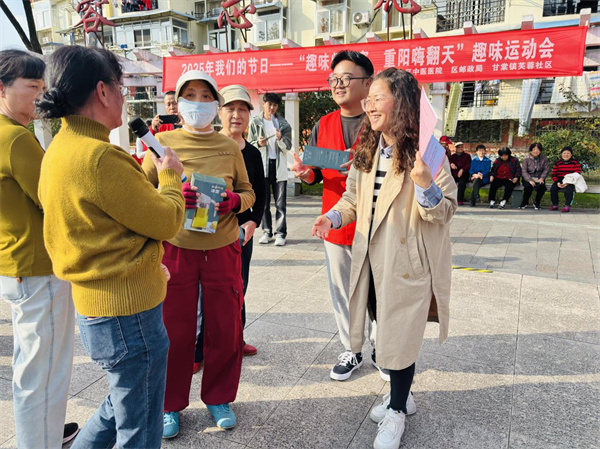 宣传实用又贴心,知识问答乐不停。社区广场上的热闹气息愈发浓厚。医保政策解读台旁,工作人员耐心为老年人讲解报销流程;反诈宣传展位前,生动的案例分享让大家绷紧防范之弦;民生实事咨询点上,居民们的疑问一一得到解答……这些接地气的宣传,像冬日里的暖阳,让实用知识悄悄住进居民心里。随着领导热情洋溢地致辞,活动正式拉开帷幕。知识问答环节瞬间点燃现场气氛,题目既有重阳登高、赏菊的传统习俗,也有医保报销、反诈防骗的生活常识。“我知道!重阳节要吃重阳糕!”“遇到陌生链接不能点!”老人们积极举手,响亮的回答里满是自信,答对时收到的小礼品,更让笑容在脸上绽放。