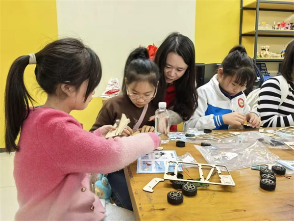 知识的灌溉终究要融入实践的土壤,备受期待的“手工探课”环节紧接着登场。在志愿者与科普老师的指导下,孩子们专注地制作太阳能小汽车:拼装车身、连接电路、固定微型太阳能板,每一步都屏息凝神,遇到难题便及时向志愿者求助。当小车在阳光下成功启动时,现场瞬间响起阵阵欢呼,诚诚举着车奔向志愿者兴奋地喊道:“您看!它动了,我也能做‘发明家’啦!” 这份亲手实践的成就感,让“绿色能源”“科技创新”的理念悄悄在孩子们心中扎根。