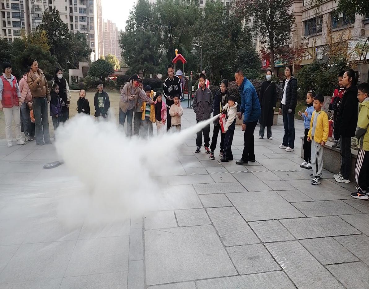 练就应急真本领理。论讲解结束后,活动场地转移至社区志愿者广场,进行更为直观的灭火器使用教学与实操体验环节。专业人员首先现场演示了灭火器的正确使用方法,并提炼出“提、拔、握、压”四字操作口诀,便于居民记忆。演示人员详细讲解了每个步骤的注意事项:如何提起灭火器并摇晃均匀,如何拔掉保险销,如何握住喷管前端,以及如何对准火焰根部进行喷射。最受孩子们欢迎的体验环节随即到来。在专业人员和社区工作人员、社工的悉心指导和安全保护下,孩子们被邀请轮流上前,亲身体验使用灭火器扑灭模拟火源。“以前只在电视上看过怎么用灭火器,今天自己动手试了才知道,原来要注意风向,要对准火苗的根部喷才行!”一位刚体验完的小朋友兴奋地分享着自己的收获。这种“零距离”的接触和实操,极大地激发了孩子们学习消防知识的兴趣,也让陪同的家长们直观地掌握了这一关键消防技能,有效提升了家庭整体的应急实战能力。