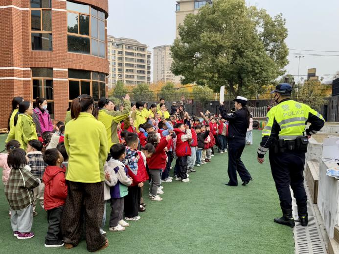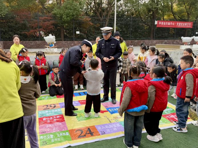 在全国交通安全日来临之际,为提升幼儿交通安全意识与自我防护能力,芜湖鸠江区官陡街道城东社区新时代文明实践站联合芜湖市公安局交管支队鸠江大队来到了辖区顶峰幼儿园,以“知识讲解+趣味问答+游戏互动”的形式开展交通安全主题活动,将安全出行知识融入幼儿生活,为孩子们的平安成长筑起“防护墙”。