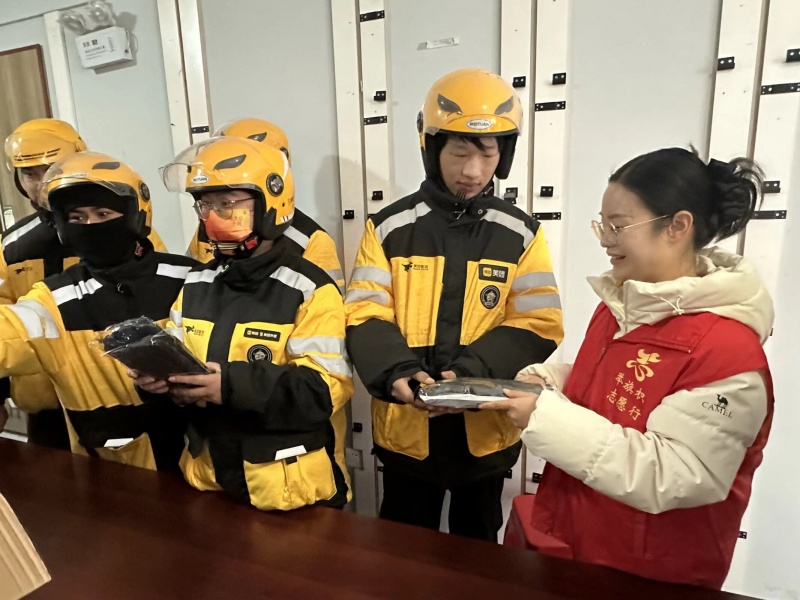 在美团站点,社区工作人员与骑手们亲切交谈,志愿者们送上的“暖心包”暗藏“巧思”:加绒手套采用防滑耐磨面料,指尖预留触屏设计方便接单;防风面罩内侧植绒亲肤保暖,有效抵御寒风侵袭;独立包装的暖宝宝,可贴于衣物内侧持续发热。这些定制物资被逐一送到骑手手中,工作人员还不忘叮嘱大家在高效工作的同时做好防寒措施,注意出行安全。