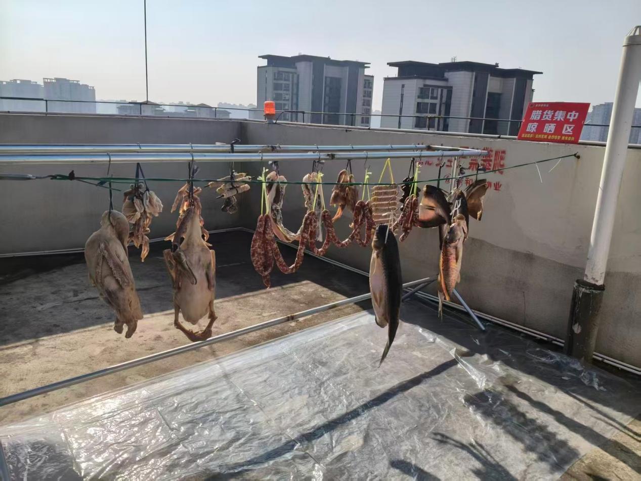为确保晾晒区实用、安全、整洁,党支部与物业充分调研园区地形,结合高层居民分布特点,最终选定10栋高层楼顶闲置区域作为集中晾晒点。随后,物业迅速行动,购置地面防油膜铺设于晾晒区地面,有效防止油脂污染地面、难以清理;定制3米×0.5米×1.3米规格的晾晒架,搭配高强度钢丝绳,确保晾晒架稳固耐用,可满足多名居民同时晾晒需求;同时,在晾晒区醒目位置设置“腊货集中晾晒区”标识标牌,明确晾晒规范与注意事项,引导居民有序晾晒。