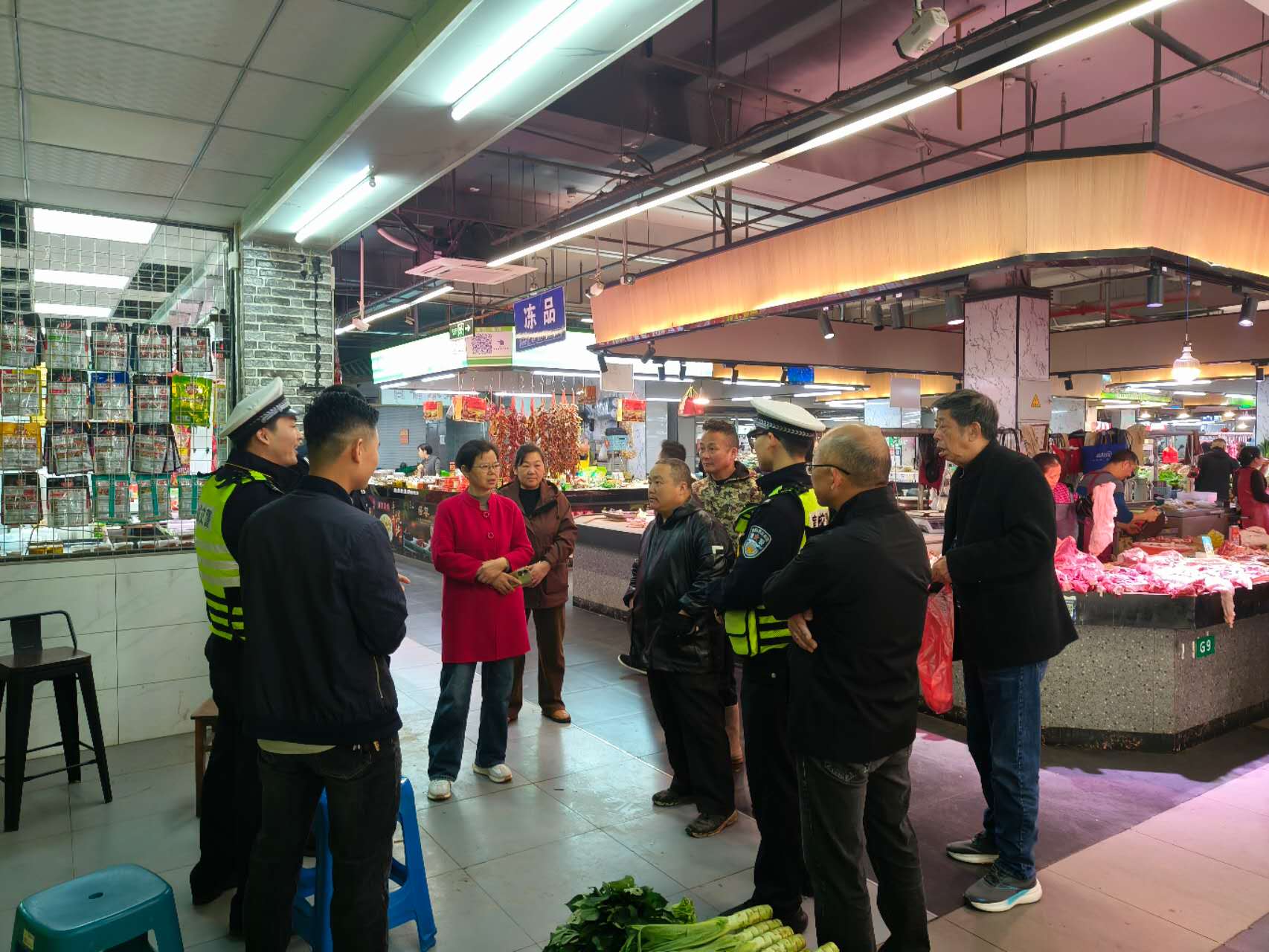 10月28日上午,民警走进宝城辖区中心菜场,在菜场入口进行宣讲,考虑到菜场商户和市民多为短途出行,民警重点围绕电动三轮车违法载人、自行车逆行、行人横穿马路等高频交通违法行为展开讲解,结合近期辖区内发生的农贸市场周边交通事故案例,用“方言+大白话”剖析违法出行的危害,吸引过往商户、市民驻足。针对商户常用电动三轮车运货的情况,重点强调“不违法载人、不超载、不逆行”;针对买菜市民,反复提醒“过马路走人行横道、不随意横穿、注意避让转弯车辆”。