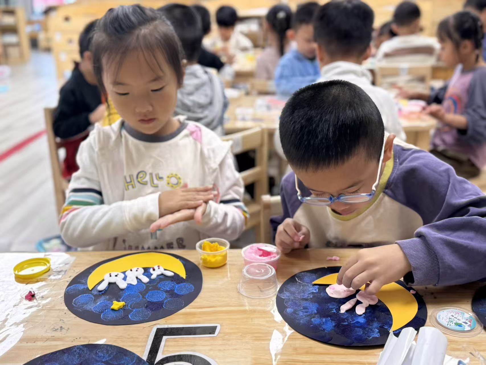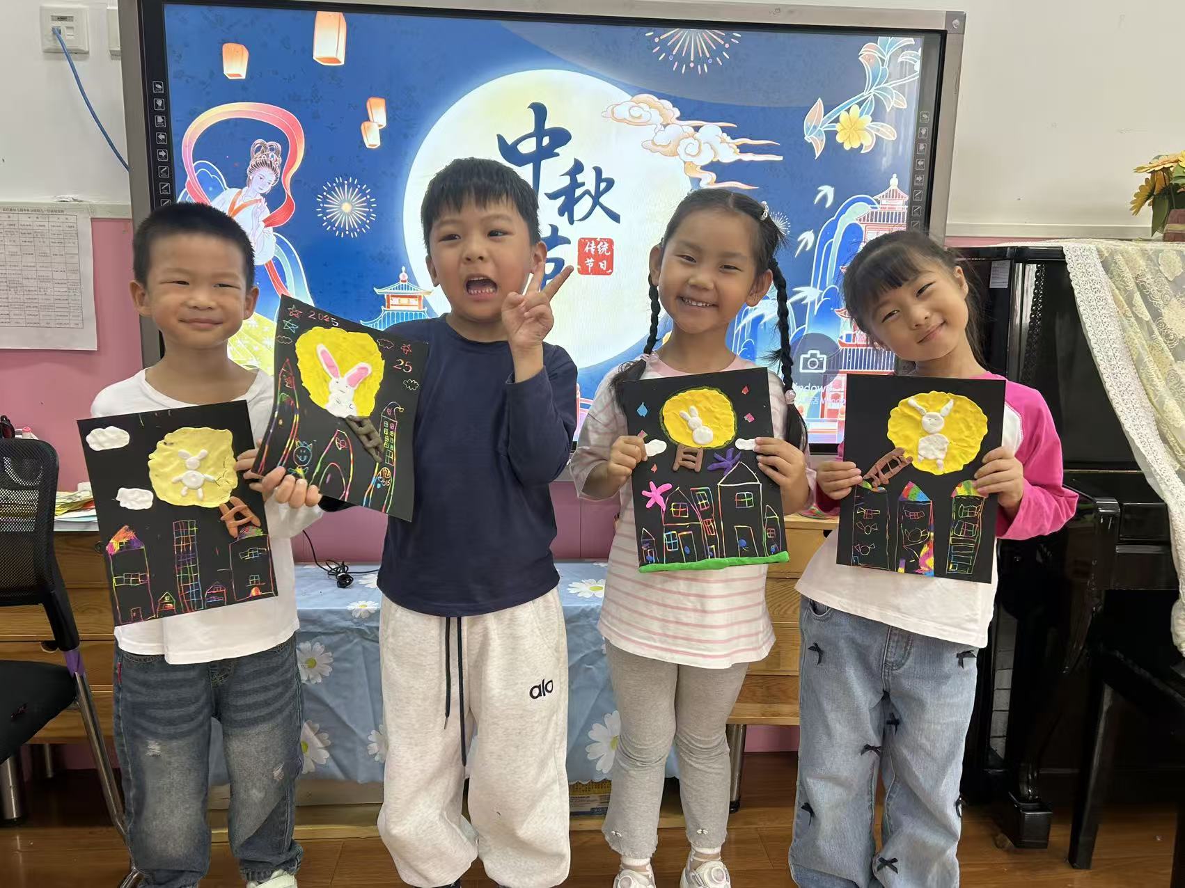 孩子们以刮画纸为底,绘出喜爱的房子;用超轻黏土捏出黄色月亮、月兔与小梯子,再用白纸剪出云朵,部分孩子还添加了烟花、月饼元素,将这些创意组合粘贴,形成一幅幅童趣满满的“月下家园”作品,在动手创作中感受中秋氛围,创意十足。