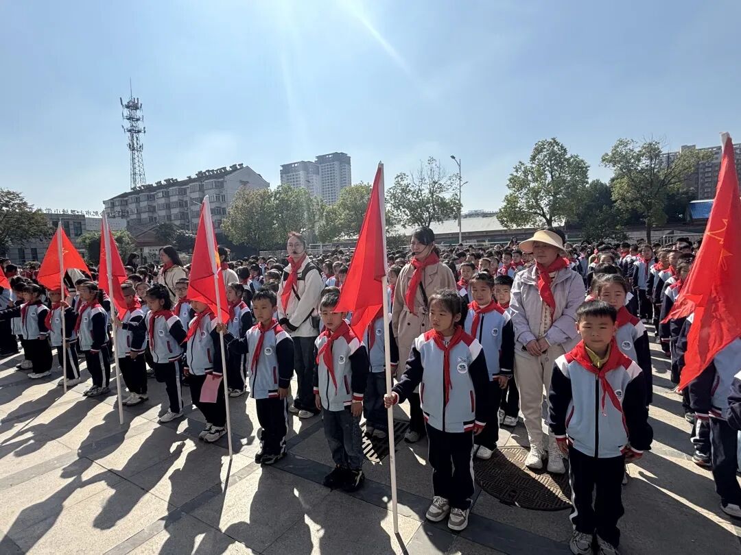上午9时55分,仪式在主持人庄严而昂扬的宣告声中正式拉开帷幕,全体师生肃立,目光追随着大队旗行进的方向,激昂的《出旗曲》奏响,旗手步伐坚定,红领巾在他们胸前熠熠生辉。随后,全体队员高唱《中国少年先锋队队歌》,“我们是共产主义接班人”的旋律回荡在校园的每个角落,传递着新时代少年的理想与担当。