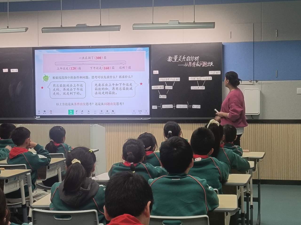公开课伊始,束静老师以一个生动的“港珠澳大桥”视频导入新课,引导学生提出问题。接着顺利过渡到例题“一共采摘了300箱,上午运走120箱,下午运走160箱,还剩多少箱?”教师通过线段图引导学生观察并思考:从条件出发可以得到什么?从问题出发需要知道什么?一步一步地明确数量关系。使孩子们既学会了如何从条件出发顺向推理计算,又学会了如何从问题出发逆向寻找条件。