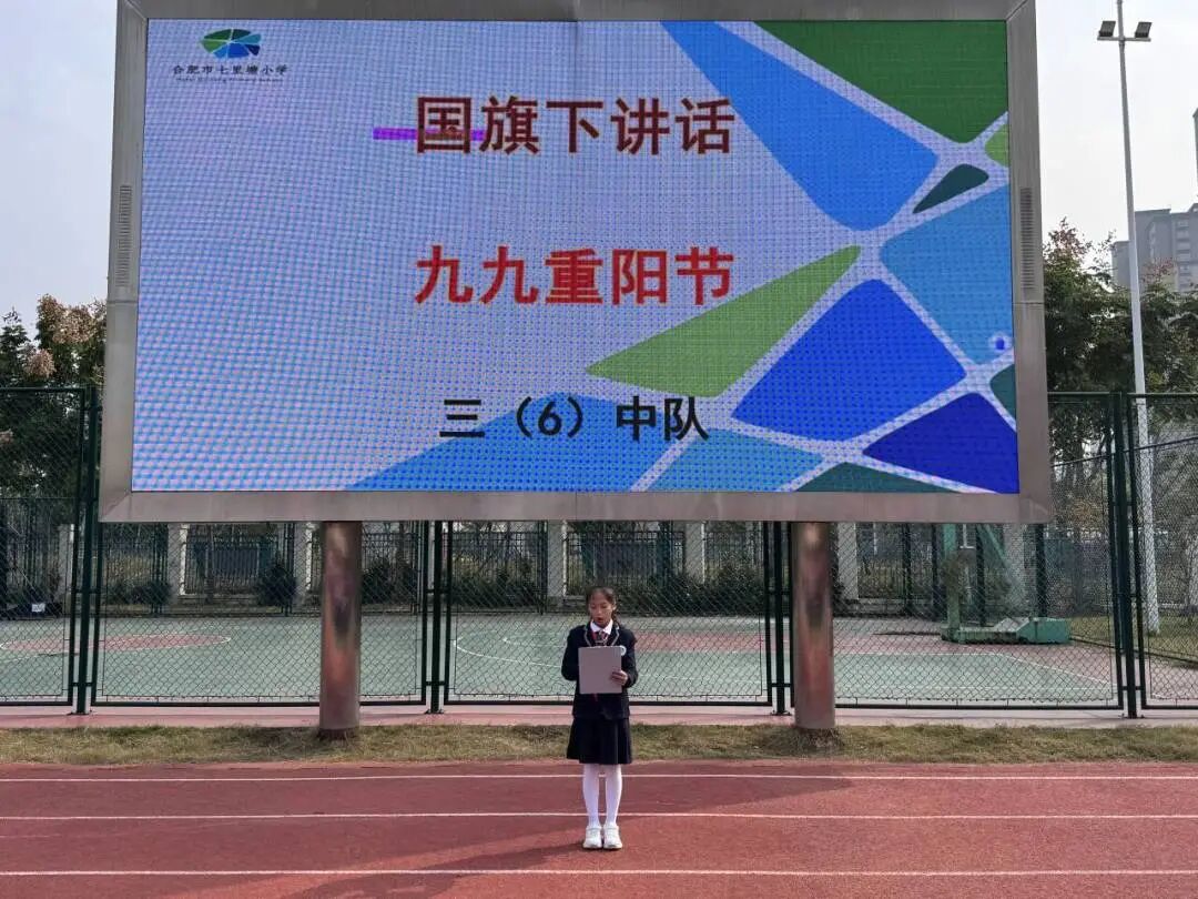 在升旗仪式上,三(9)班学生代表以“重阳”为题进行国旗下讲话,巧妙地将“九九”喻为“两座小山”,传递“长久”之意,并联系“老人节”内涵,倡导同学们从为长辈捶背、端茶、拥抱等日常小事践行孝心,让敬老意识融入生活。