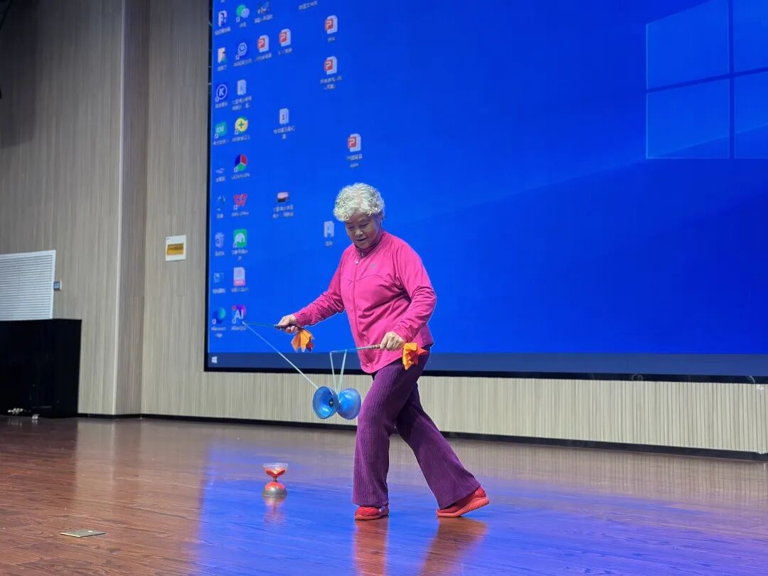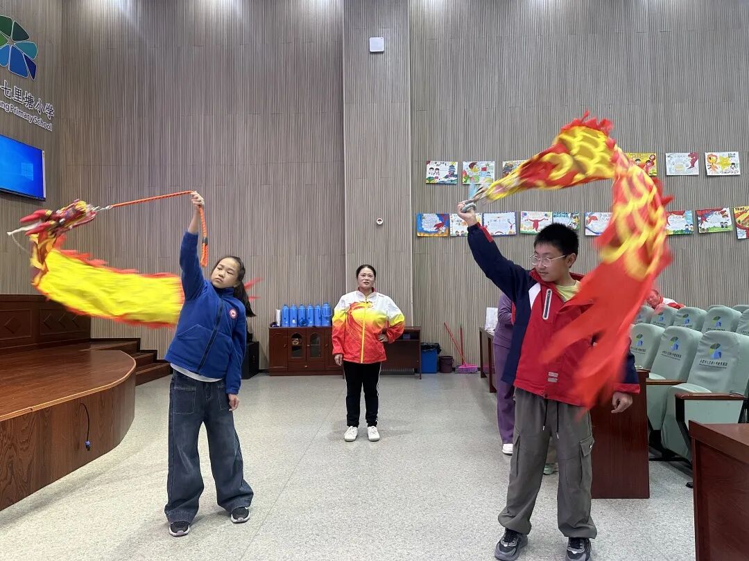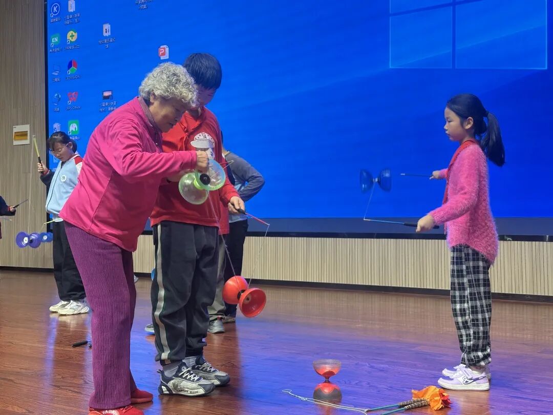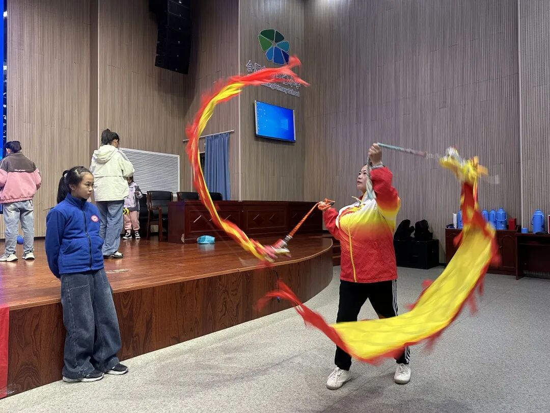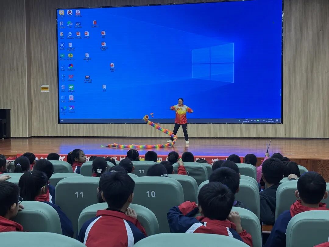 活动伊始,精彩的表演展示便点燃了现场气氛。首先登场的是汪老师带来的双碗空竹表演,只见空竹在老师手中轻盈流转,时而上下翻飞,时而围绕身体旋转,碗与空竹的完美配合展现出独特的韵律之美,台下学生纷纷发出阵阵惊叹。紧接着,潘老师领衔的舞龙表演震撼亮相,鲜艳的龙身随着老师的动作腾跃盘旋、灵动飞舞,将龙的气势与神韵展现得淋漓尽致,让学生们直观感受到传统民俗表演的磅礴魅力。