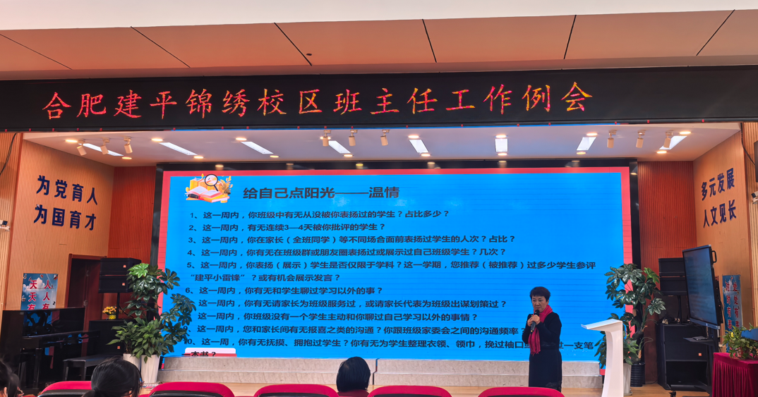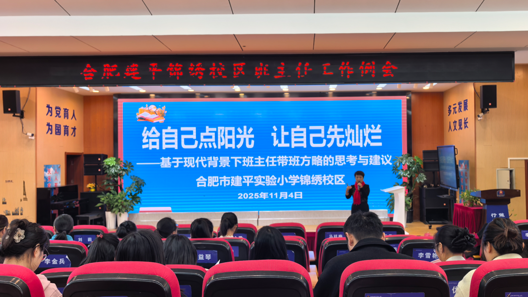 11月4日,合肥市建平实验小学锦绣校区的班主任工作例会如期举行。此次例会以“给自己点阳光让自己先灿烂——基于现代背景下班主任带班方略的思考与建议”为核心,将“为党育人,为国育才”的教育使命融入细节,为班主任团队搭建起一场聚焦温情育人、助力专业成长的深度交流平台。
