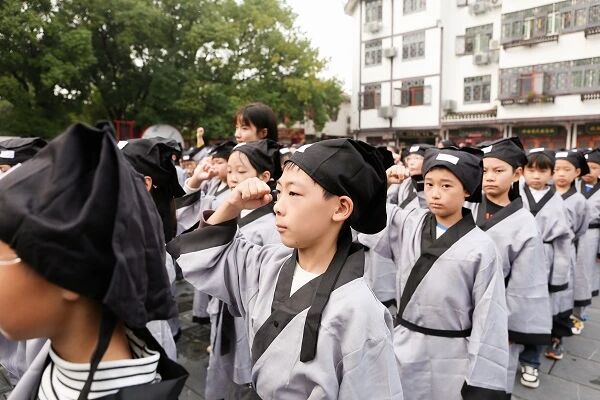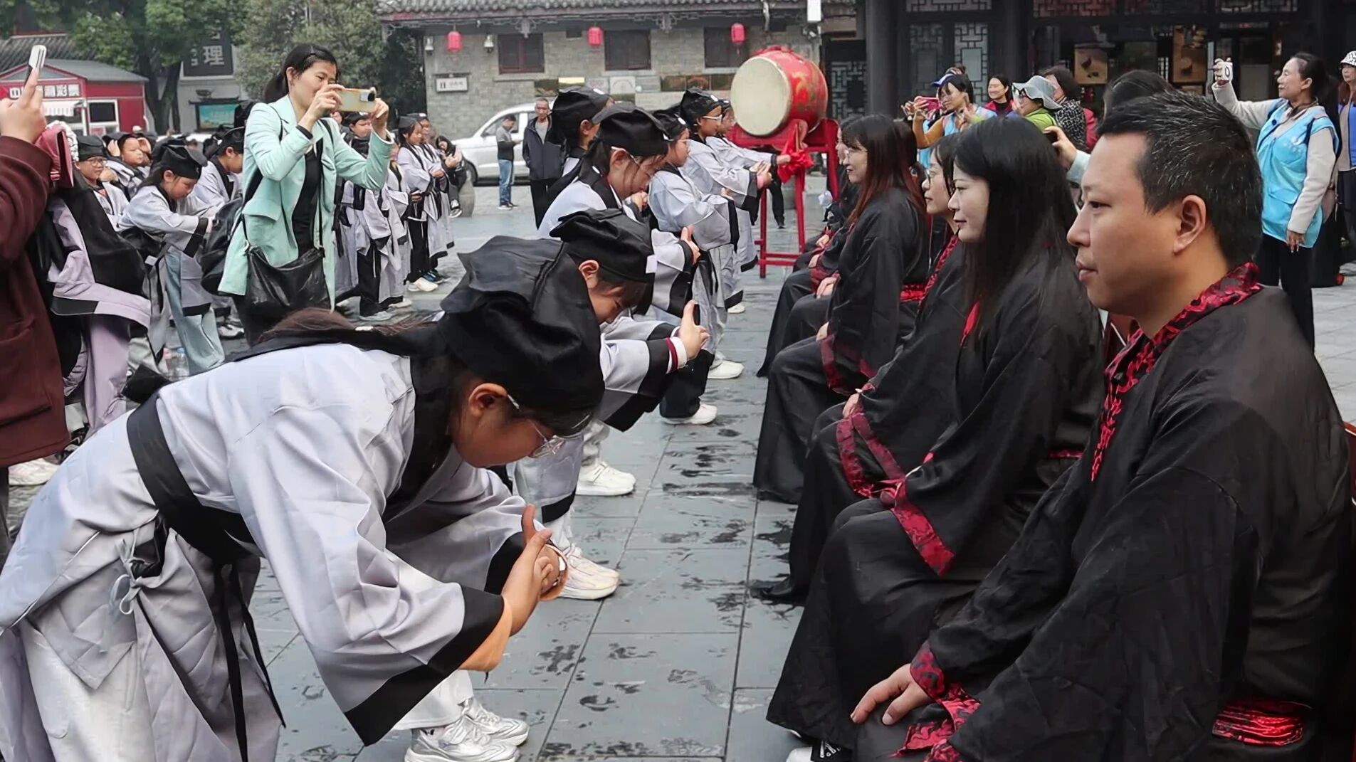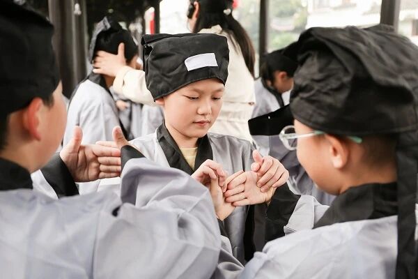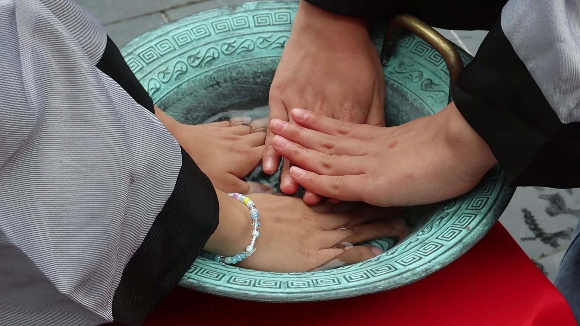 仪式环节层层递进,每一步都饱含深意。全体师生先“自正衣冠”,认真整理衣物、端正帽饰,在细微举动中领悟“正身正心”的道理;随后,8名班级代表以两班为一组行“沃盥礼”,净手静心,寓意以洁净双手开启知识探索之路。“朱砂启智”环节温情满满,带队老师们手持朱砂,逐一在学生眉心轻点,一抹鲜红寄托着“开启智慧、明辨是非”的美好期许。
