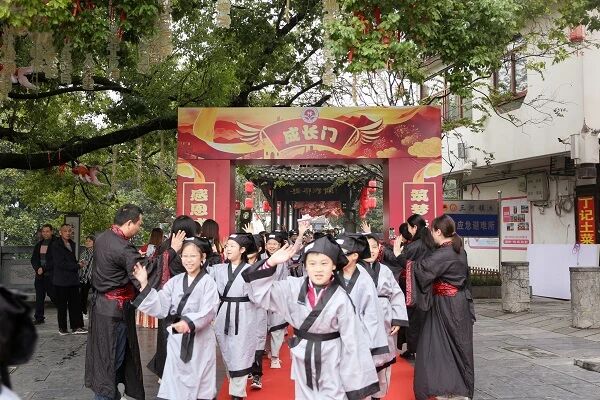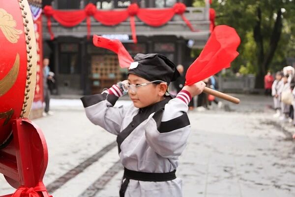 随后,学生代表领诵《朱子家训》节选,勤俭箴言回荡广场;“击鼓鸣志”中,鼓声铿锵宣告少年志向;全体学生右手握拳,随主持人庄严宣誓,嘹亮誓言彰显责任担当。最后,孩子们按班级顺序在许愿墙上描写“长”字,师生合影定格珍贵时刻。
