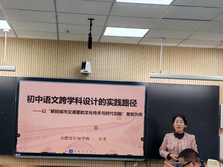活动的第二环节,合肥市行知教育集团的许秀老师作了题为《初中语文跨学科设计的实践路径——以“解码城市交通里的文化传承与时代创新”为例》的专题讲座。她巧妙地将经典课文《中国石拱桥》与合肥现代地铁元素相融合,并联动美术、信息等学科,结合了优质文本,真实情境,文化浸润三个方面,深入挖掘了民生主题与工匠精神,其精彩的讲解为在场教师提供了宝贵的实践范例。
