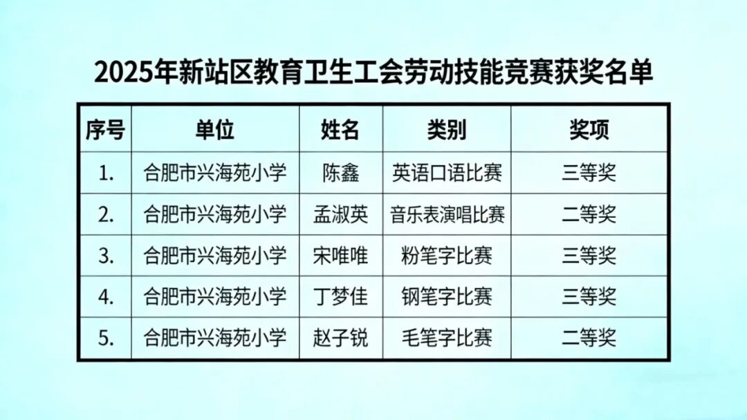 近日,2025年新站高新区教育卫生工会劳动技能竞赛圆满落幕,合肥市兴海苑小学选派的五位教师在竞赛中表现突出。他们依托扎实的专业基础与稳定的现场发挥,在英语口语、音乐表演唱、粉笔字、钢笔字、毛笔字五大项目中成功突围、斩获佳绩,有力展现了学校教师队伍过硬的专业素养和良好的精神风貌。