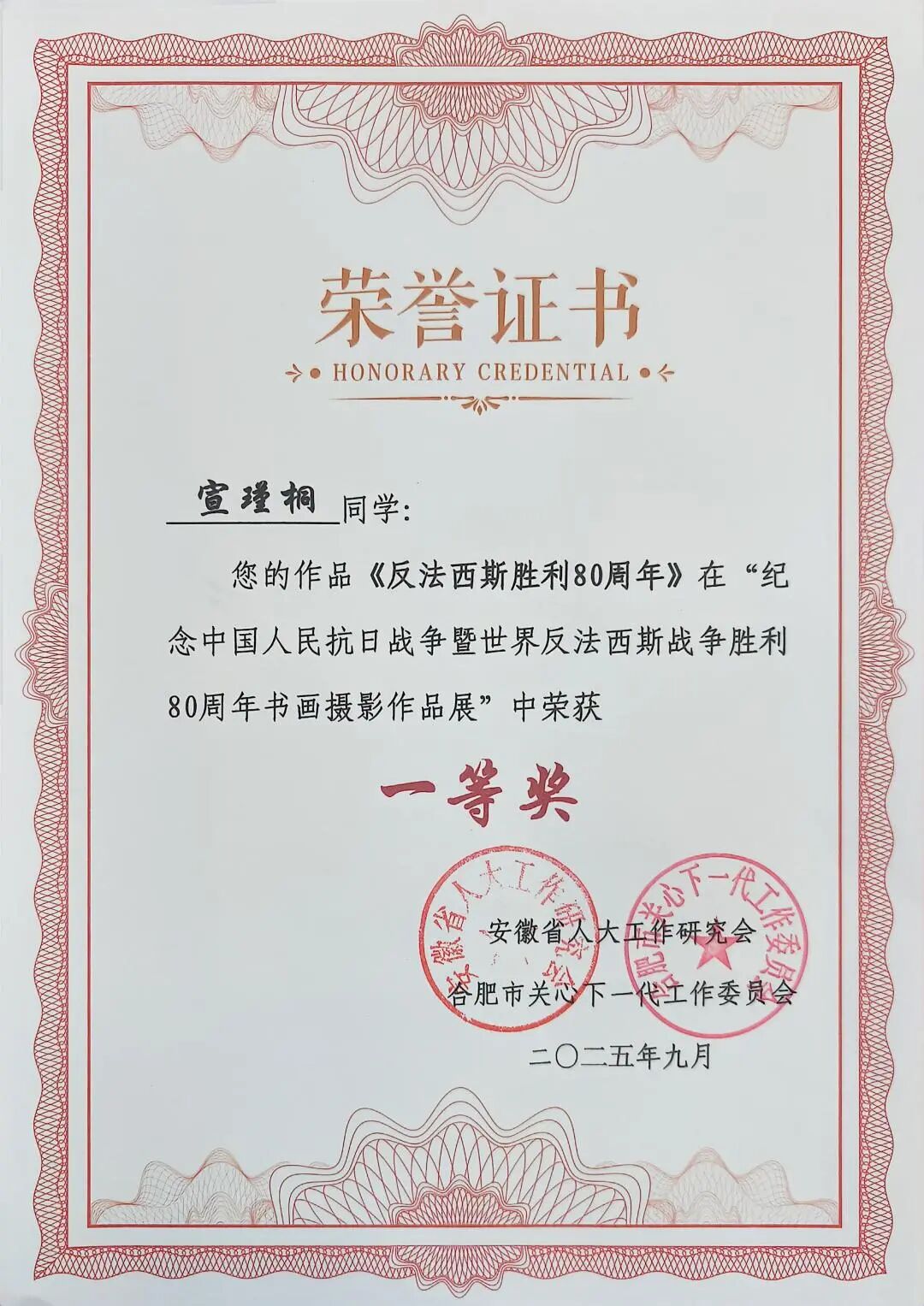 此次获奖历经校级选拔、区级角逐到市级评审的层层考验。宣瑾桐同学的作品从全校众多参赛作品中脱颖而出,顺利晋级区级比赛后,又凭借深刻的主题内涵、扎实的艺术功底在区级评选中崭露头角,最终在全市优秀作品的激烈竞争中斩获一等奖,每一步都凝聚着她的努力与坚持。