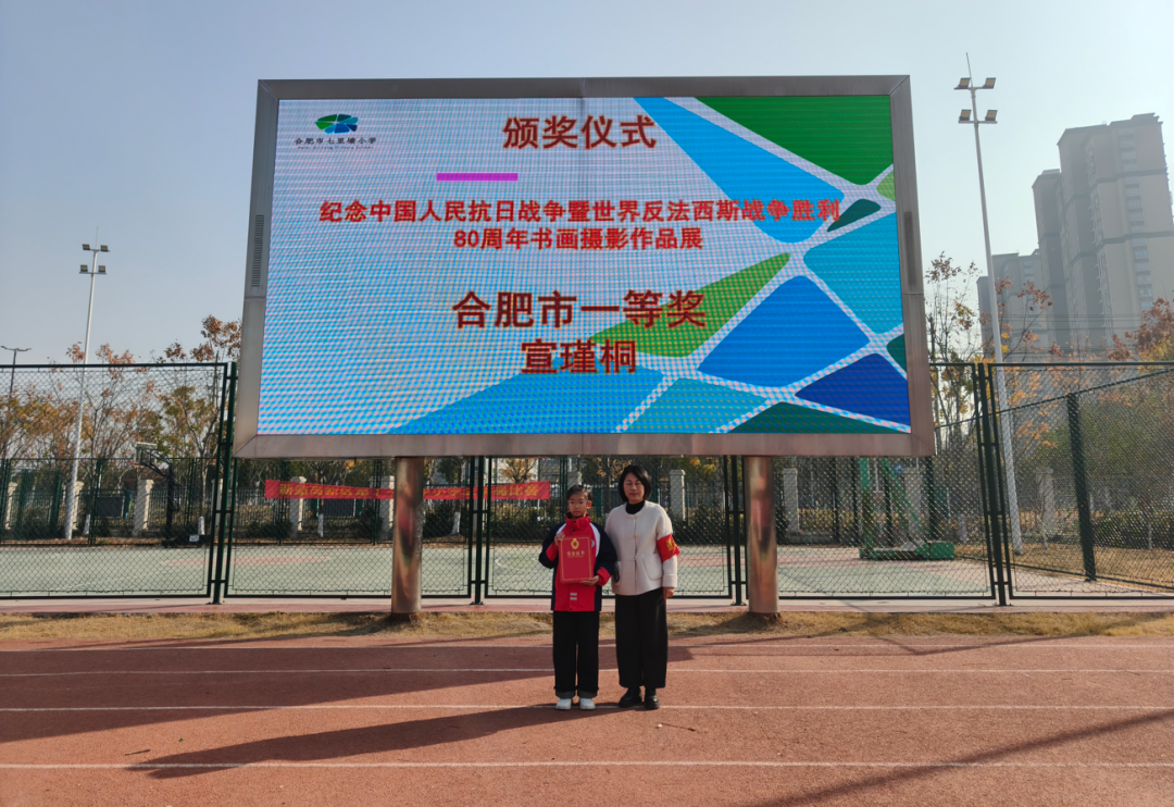 2025年12月8日上午,合肥市七里塘小学升旗仪式上,周本群校长为四(3)班宣瑾桐同学颁发“纪念中国人民抗日战争暨世界反法西斯战争胜利80周年书画摄影作品展”合肥市一等奖奖状,全校师生共同见证这份来之不易的荣誉。