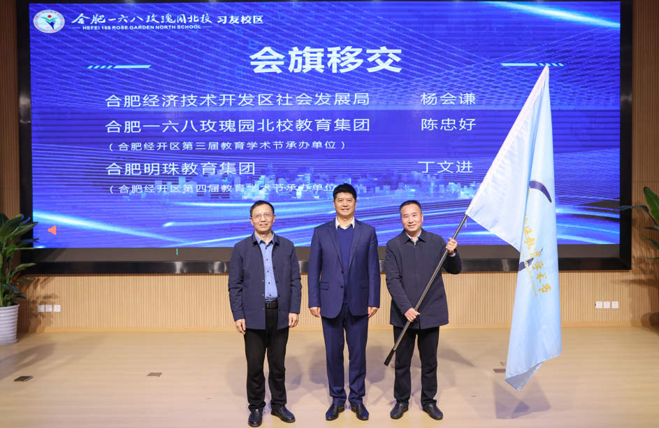 闭幕式上还举行了庄重的会旗交接仪式,由合肥经济技术开发区社会发展局副局长杨会谦,合肥一六八玫瑰园北校教育集团书记、总校长陈忠好,合肥明珠教育集团翡翠学校校长丁文进共同完成,象征着教育学术精神在区域内的延续与传递。