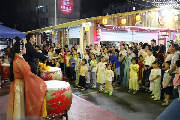 不同于传统夜市的单一业态,本次国庆夜市以“平民生活”为核心,将本土文化传承与夜间消费场景深度融合。夜幕降临,平民生活夜市灯火璀璨,舞台区成为最热闹的“文化窗口”——由甘棠社区村书记带头,村民自编自演的民俗节目轮番登场,让游客在逛吃之余沉浸式感受甘棠镇的文化底蕴,也让“干群同心庆国庆”的温情在互动中传递,提前点燃节日喜庆氛围。