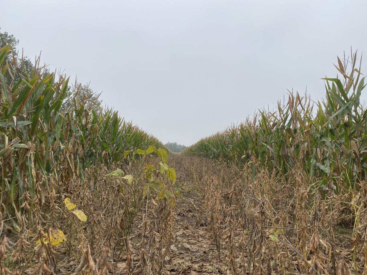 金秋十月,在濉溪县四铺镇洪南村的大豆玉米带状复合种植基地里,一排排玉米秆上挂满了金黄饱满的果穗,中间种植的大豆伸展着串串金色豆荚,两种农作物一高一低间隔种植,取长补短,收获喜人。