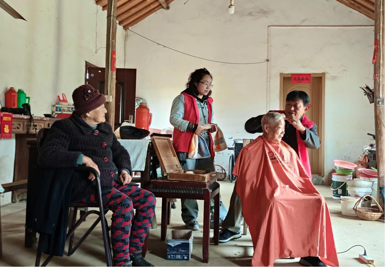 清晨的阳光刚铺满村落,志愿者理发师杨礼平便已整理好干净整洁的理发用具,打包进箱包,踏着暖阳奔赴服务对象家中。在老人家中,他熟练地为老人围上围布、梳理发丝,耐心询问老人的发型喜好,动作轻柔且专业。推子与梳子在手中灵活运转,不多时,老人们原本凌乱的头发便变得整齐利落,脸上纷纷绽放出舒心的笑容。