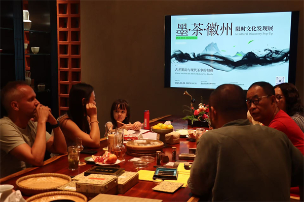黄山花隐秘境民宿的莫问茶馆内,十月“非遗主题雅集”轮番上演:“墨韵茶香”中书法与茶道相映成趣,“竹编茶趣”里巧手勾勒生活美学,“瓷语茶心”间细述茶器与茶汤的默契。来自德国的一家三口在“竹编茶趣”活动中流连忘返。