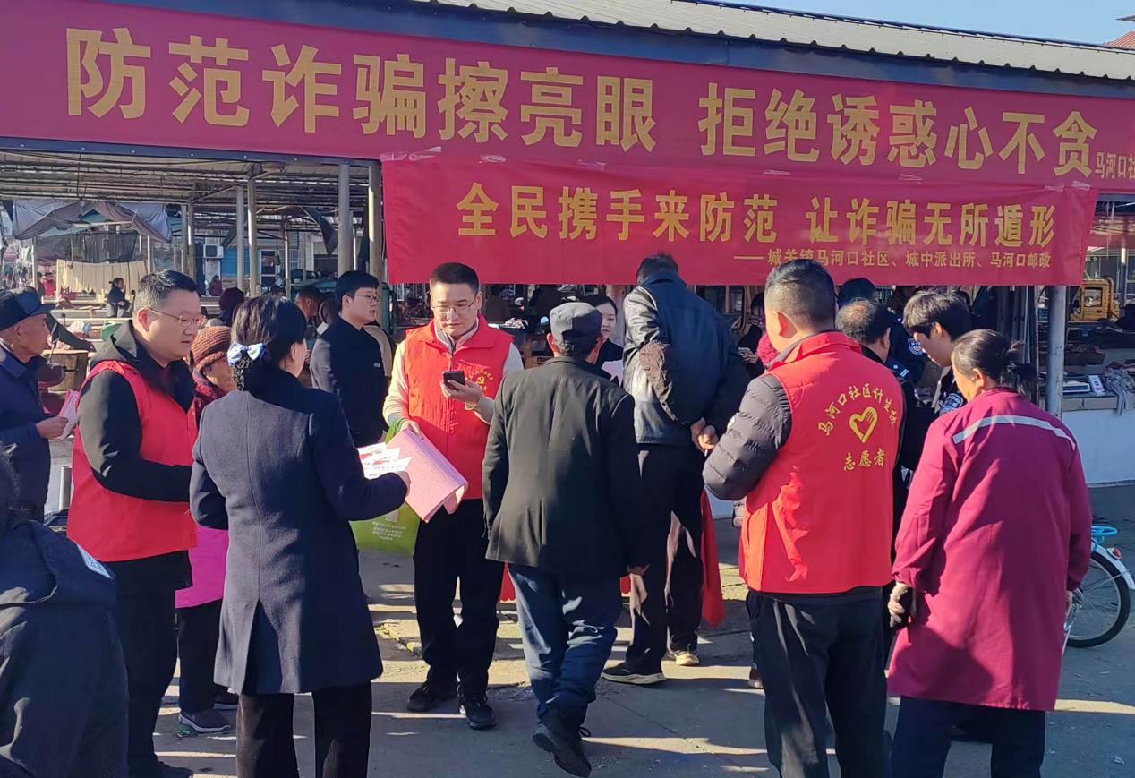 在马河口农贸市场人员密集场所,社区志愿者、派出所民警和邮政储蓄工作人员,向居民发放反诈宣传彩页、宣讲常见诈骗伎俩和手段,并“以案说诈”向居民开展警醒宣传,增强宣传效果,提高居民防范意识,捂紧民生“钱袋子”。