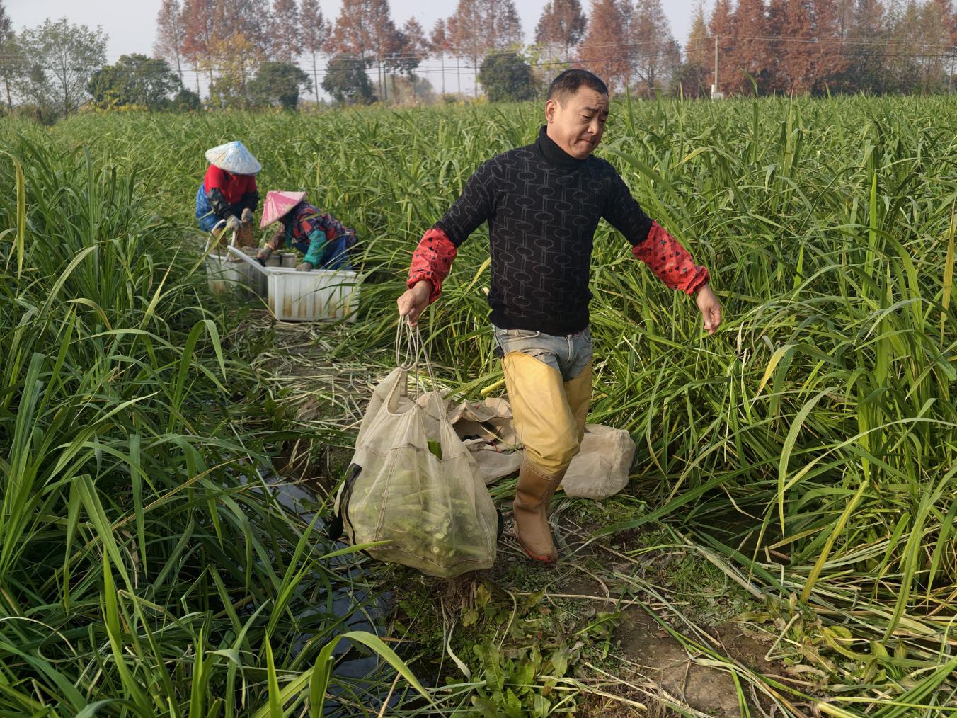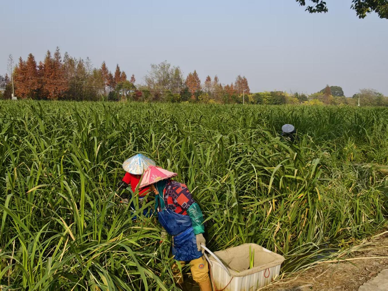 在茭白基地,种植大户孙昌武笑着算起收益账,丰收带来的是百姓实实在在的收入增长。周茭家庭农场茭白种植面积有150余亩,从育苗、插秧到采收、加工,全程需要大量人工,仅采收季每天就有近35名村民在基地务工,每年将为在基地务工的当地老百姓创造35万元以上的就业收入,不少家庭因此实现了“增收不跑路,挣钱顾家两不误”;双季茭白亩产量达8000多斤,今年行情很好,带壳的发往江浙沪,一斤能卖3元左右,去壳后能卖到6--10元,采收后经分拣打包,可直供周边城市大型批发市场,亩均收益在2万元左右;茭白产业不仅让种植户受益,更为村民带来家门口的务工机会。