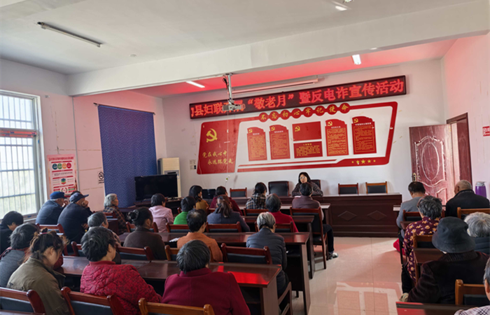 正值“敬老月”之际,为守护农村老年群体的财产安全与身心健康,临泉县妇联副主席张传贞、王梅,办公室主任蒋红玲一行3人走进桃花店村,开展敬老月暨反电信诈骗宣传活动。