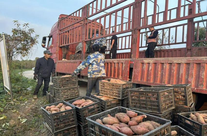 在新农村红薯种植基地,榴莲蜜薯迎来采收期。田间地头,二十余名农民正热火朝天地忙着采收,割蔓、翻薯、分拣、装箱……交织成一幅金秋丰收的美好图景。
