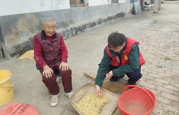 温情相伴,共话家常。清早,志愿者沈浩蹲坐在板桥社区高龄老人李锦章身旁,细心整理老人收获的黄豆。李奶奶笑容满面地看着志愿者,眼中满是欣慰。沈浩与老人亲切交谈,询问其健康状况与生活需求,并叮嘱老人注意防寒保暖。“窗帘之约”是有效夯实基层治理的生动实践,通过每日敲门走访,及时掌握老人生活动态,传递无声的守护。